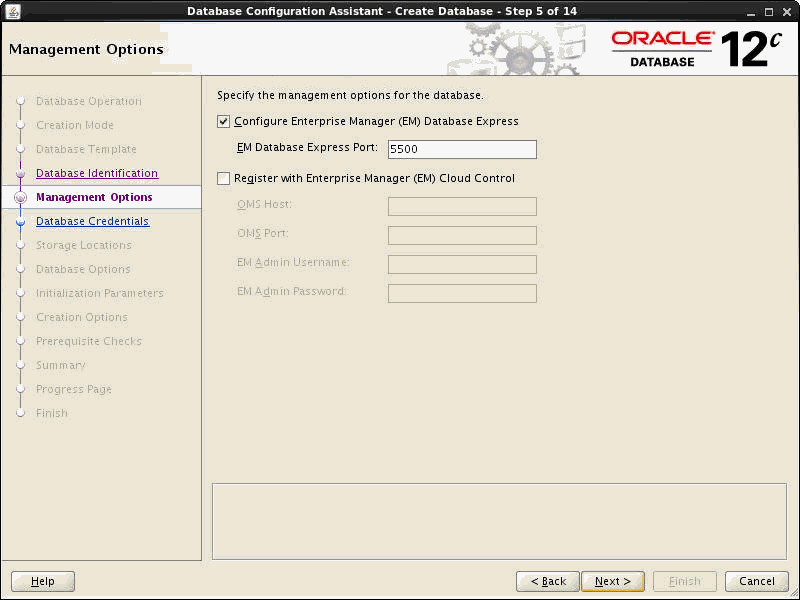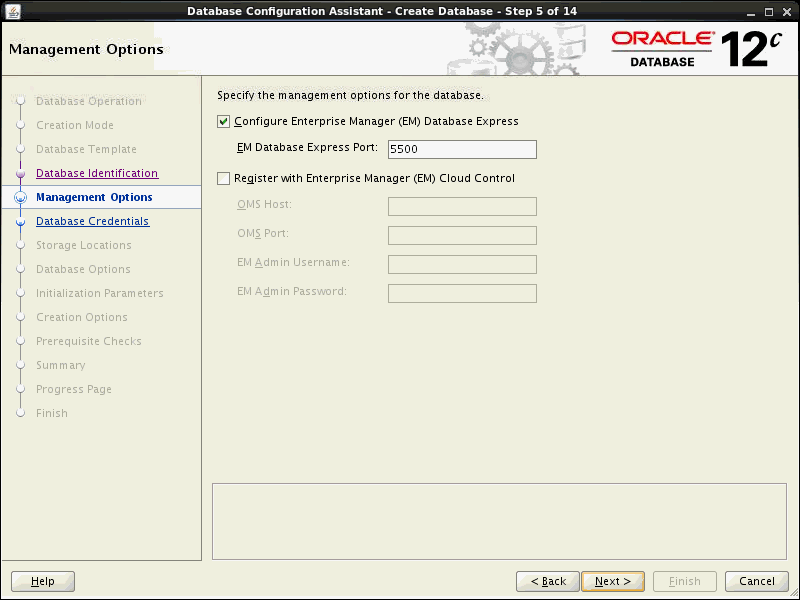 Note: The Create as Container Database option is enabled to create the database as a CDB that can support zero, one, or many user-created PDBs. If you want DBCA to create a PDB when it creates the CDB, specify the PDB name in the Pluggable database name field. -