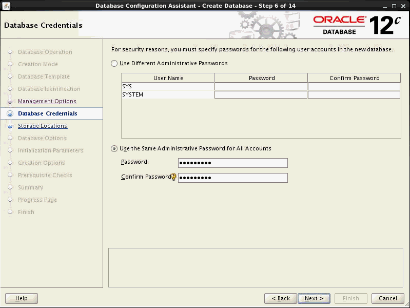 The Specify Schema Passwords window appears. Specify separate passwords for the SYS, SYSTEM, and DBSNMP users or select "Use the same password for all accounts." Enter the password(s) in the Password and "Confirm password" fields. Click Next.