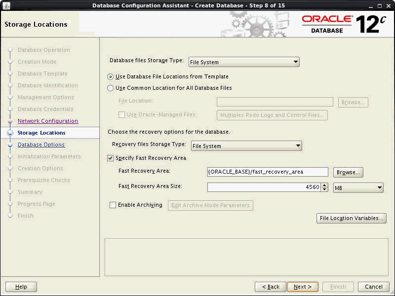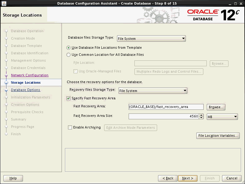 The Storage Locations window appears. In the Database Files region, select File System in the Storage Type menu. Select "Use Database File Locations from Template." In the Recovery Related Files regions, select File System in the Storage Type menu. Accept the default value for the Fast Recovery Area. Click Next.