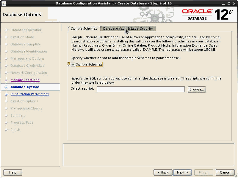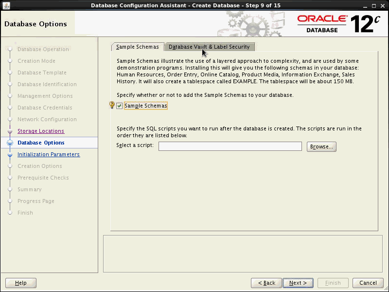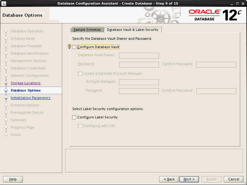 The Database Options window appears. On the Sample Schemas tab, select Sample Schemas. Click the "Database Vault & Label Security" tab.