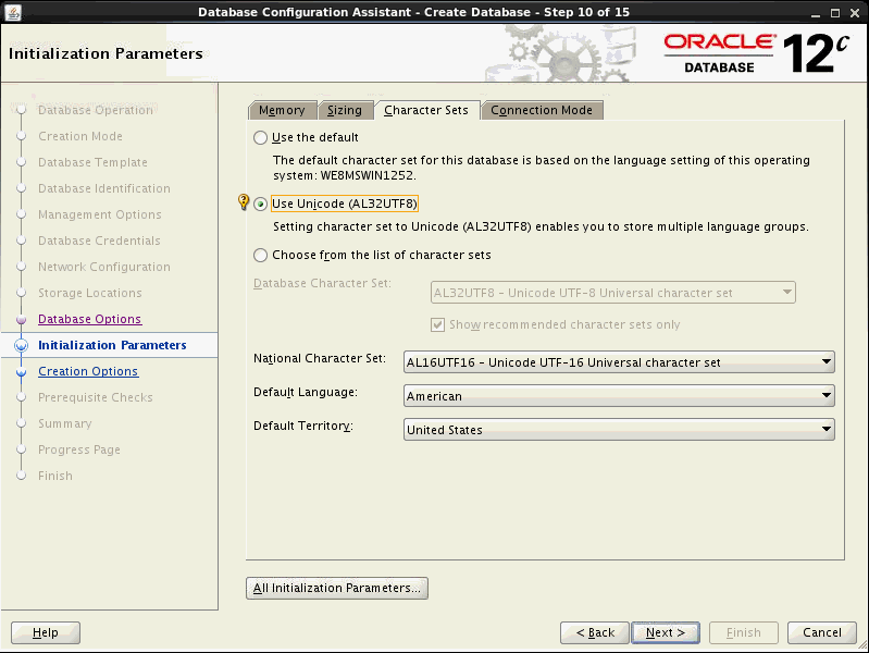 On the Character Sets tab select "Use Unicode (AL32UTF8) " or change it as appropriate for your installation. Click the Connection Mode tab.