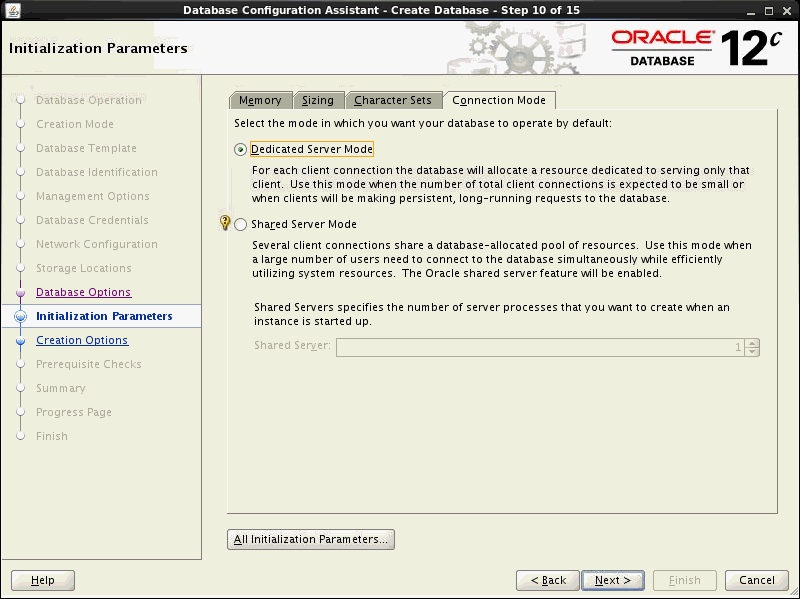 The Initialization Parameters window appears. Accept the default value of Memory Size(SGA and PGA) and select Use Automatic Memory Management under Typical Settings option. Modify the value in Memory Size if necessary for your installation . Click the Sizing tab.