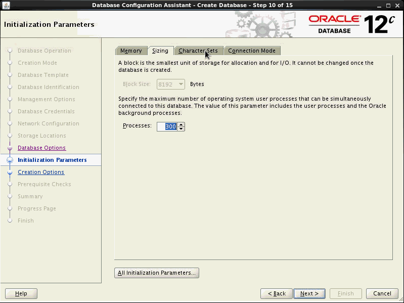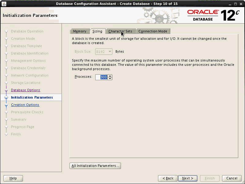 On the Sizing tab accept the default value in the Processes field or change it as appropriate for your installation. Click the Character Sets tab.