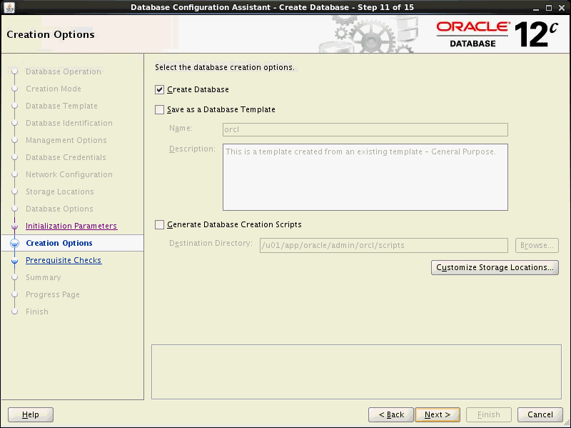 If you chose to install the Oracle Database software only and did not create a database, or if you want to create additional databases, you can do so by using the Database Configuration Assistant (DBCA). DBCA offers two modes: typical and advanced. If you choose Advanced Mode, you can customize storage locations, initialization parameters, management options, database options, and different passwords for administrator user accounts.