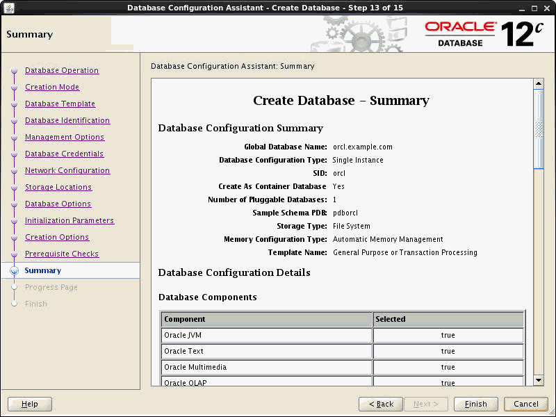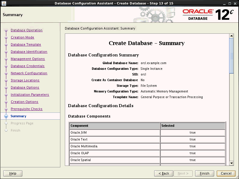 The Summary window appears. Review the settings. Click Install to install the Oracle Database software and create the database.