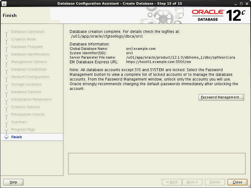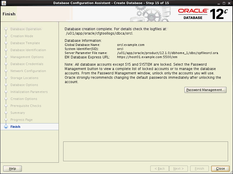 The Database Configuration Assistant window appears indicating the database has been created. Select Password Management to unlock the user accounts or perform this task at a later time. Click Close.