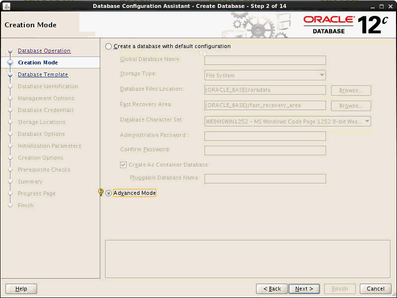 The Creation Mode window appears. Ensure that Create a database with default configuration is selected. Enter a value in the Global Database Name field. Select File System in the Storage Type menu. Accept the default values for Database Files Location and Fast Recovery Area. Select AL32UTF8 - Unicode UTF - 8 Universal character set in the Database Character Set menu. Enter a password for the SYS and SYSTEM users in the Administrative Password and Confirm Password fields. Ensure that Create As Container Database check box is selected and provide a Pluggable database name such as pdborcl. Click Next.