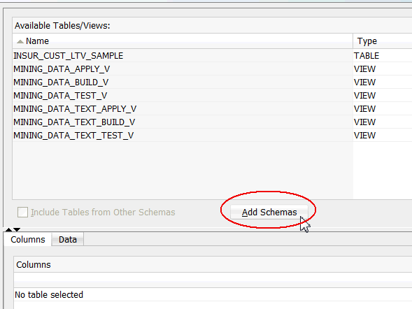 A. Click Add Schemas, beneath the Available Tables/Views list, as shown here: