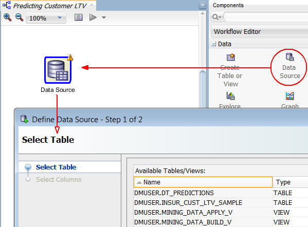 Notes: In the Define Data Source wizard, only tables and views owned by the user are displayed by default. However, for this workflow, you want to use a table in the SH schema.