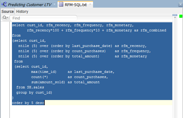 A. In the SQL Developer main menu, select File > Open. Using the Open dialog box, navigate to the location where you saved the RFM-SQL.txt file, select the file, and click Open.