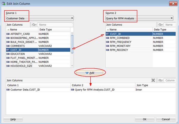 - Select Customer Data as Source 1, and Query for RFM Analysis as Source 2.