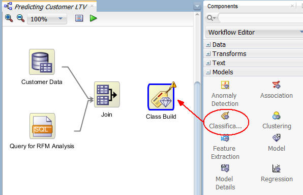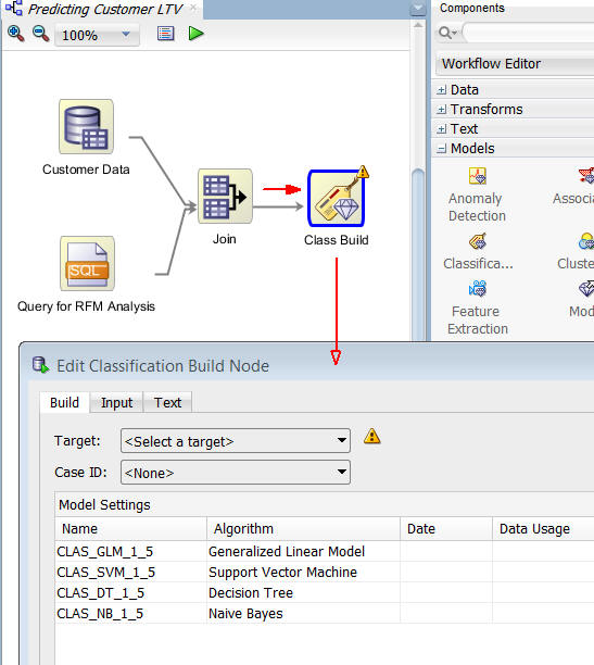 In this topic, you add a Classification node to the workflow, like you did in the Using Oracle Data Miner 4.0 tutorial. However, in this scenario, you will remove two of the default algorithms from the Class Build node and define only the Decision Tree and SVM models.