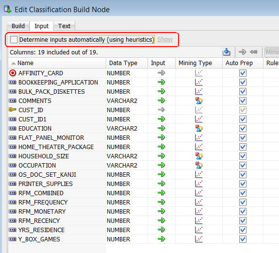 Result: The Input option for all of the attributes except AFFINITY_CARD (the Target) and CUST_ID (the Case ID) may be modified