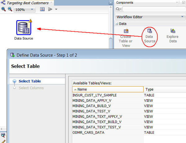 A. From the Data category in the Components tab, drag and drop a Data Source node to the workflow canvas, as shown below. The Define Data Source wizard opens automatically.