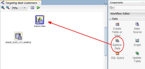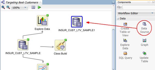 - Workspace node names and model names are generated automatically by Oracle Data Miner. In this example, the name "Data Source" is generated. You may not get exactly the same node and model names as shown in this lesson.