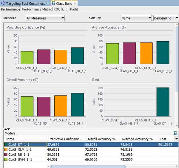 Results: A Class Build display tab opens, showing a graphical comparison of the four models in the Performance tab, as shown here: