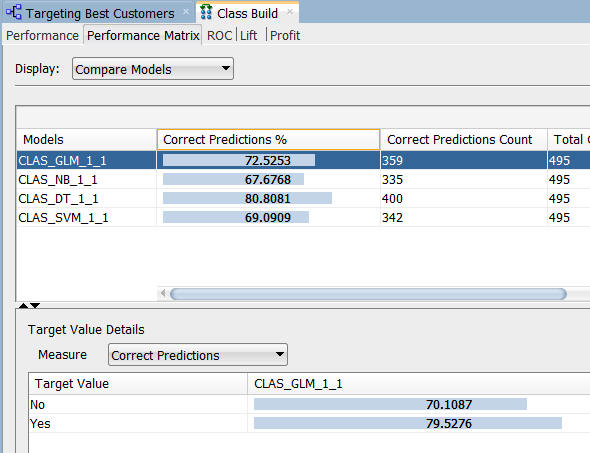 Note: The Performance Matrix shows that the DT model has the highest Correct Predictions percentage, at almost 81%. The GLM model is next at 72.5%.