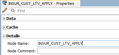 Select the new data source node, and using the Details section of the Properties tab, change the Node Name to INSUR_CUST_LTV_APPLY, like this: