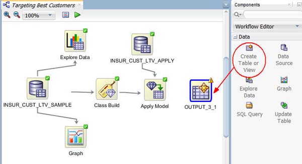 A. Using the Data category in the Components pane, drag the Create Table or View node to the workflow window, like this: