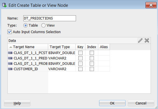 2. In the Edit Create Table or View Node window, change the default table name to DT_PREDICTIONS, as shown here:
