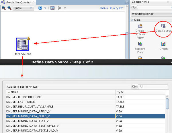 A. In the Components tab, drill on the Data category, drag and drop a Data Source node on the workflow, and select MINING_DATA_BUILD_V from the Available Tables/Views list in the wizard, as shown here:
