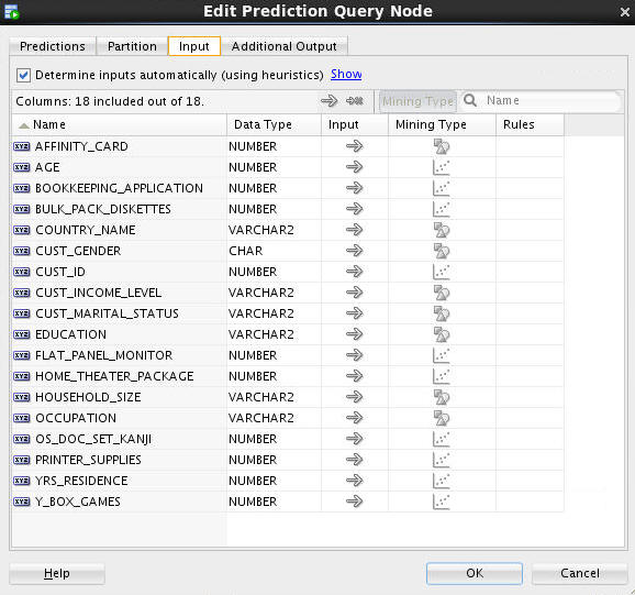 By default, inputs are automatically determined using heuristics. If you want to remove or modify the mining type of any input column, you must deselect this option.