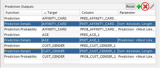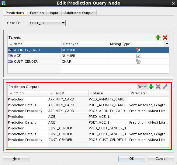 Notes: By default, three prediction output columns are generated for a target attribute with a Categorical mining type (AFFINITY_CARD and CUST_GENDER), and two output colums generated for a target with a Numerical mining type (AGE). You can add or remove prediction output columns.