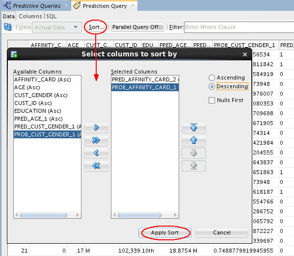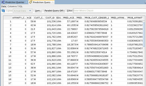 - In the example, output columns have been resized to provide a more complete view of the results. You can scroll horizontally and vertically to view more of the prediction query data.