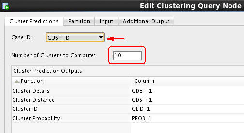 Double-click the Clustering Query node to open the Edit Clustering Query Node window. Then, perform the following on the Predictions tab: