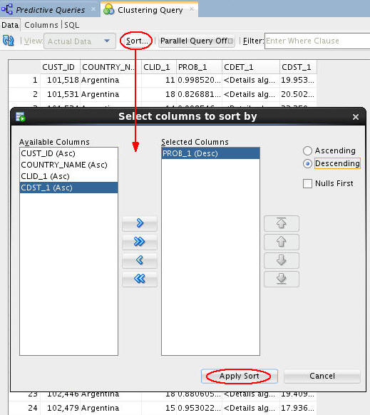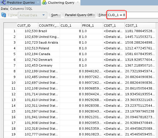 Result: A tabbed window displays the data, including: Output Columns (CUST_ID, COUNTRY_NAME) and Cluster Prediction Outputs (CLID_1, PROB_1, CDET_1, CDST_1)