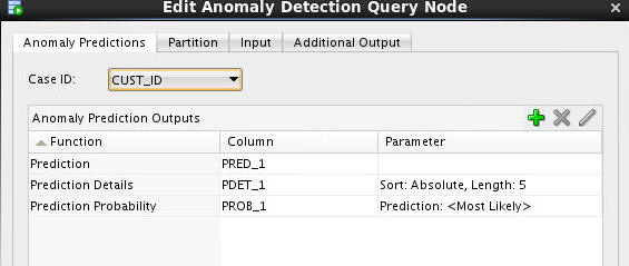 Double-click the Anomaly Detection Query node to open the Edit Anomaly Detection Node window. Then, on the Anomaly Predictions tab, select CUST_ID as the Case ID attribute.