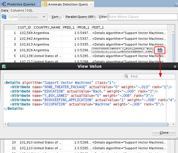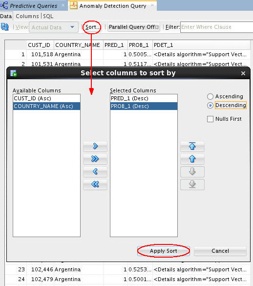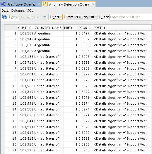 Result: A tabbed window displays the data, including: Output Columns (CUST_ID, COUNTRY_NAME) and Anomaly Prediction Outputs (PRED_1, PROB_1, PDET_1).