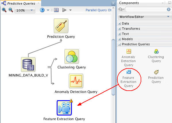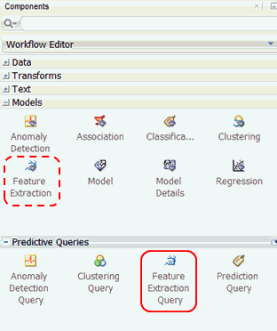 When defining a Feature Extraction Query node, you specify similar attributes to a Feature Extraction model, but when the Query option is run, the Data Mining engine performs dynamic scoring of the clustering query without having to pre-define a model.