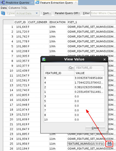 Result: A tabbed window displays the data, including the output columns and Feature Set definition column. Just like with the Anomaly Detection Query, expanded prediction details are also provided for Feature Extraction Query, as shown here: