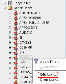 G. Right-click DMUSER from the Other Users list, and select Edit User from the menu. Then select the SQL tab to view the SQL code and results.