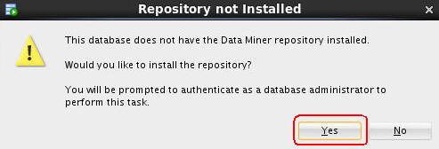 Result: A message tells you that the Data Miner Repository is not installed in the database, and asks you if you want to install the Repository.