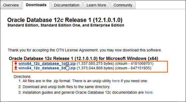 In this OBE, we install Oracle Database 12c. Accept the license agreement and click the files under Oracle Database 12c Release ... for Microsoft Windows (x64) to download.
