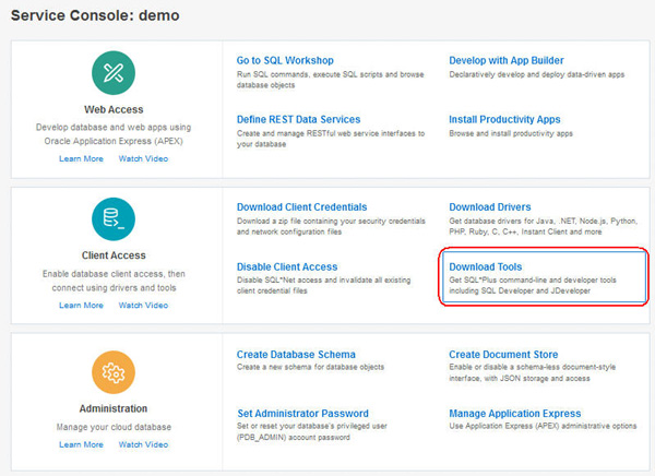 In the Download Tools window, select SQL Developer.