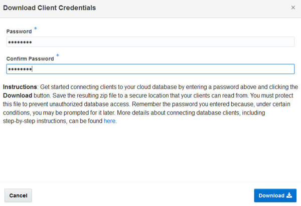 NOTES: This password will serve as the "Keystore Password" in your SQL Developer connection to the SH schema in your Exadata Express Oracle Database instance. In the same way as your database schema password, this password must contain at least 8 characters, including at least one capital letter, one number, and one special character.