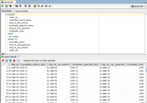 SELECT * FROM sh.sales WHERE rownum <= 50;The output looks like this: