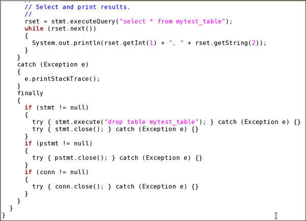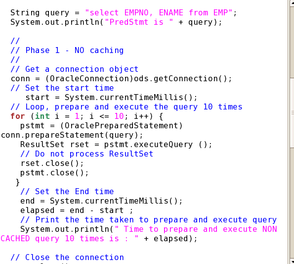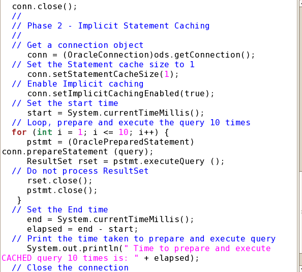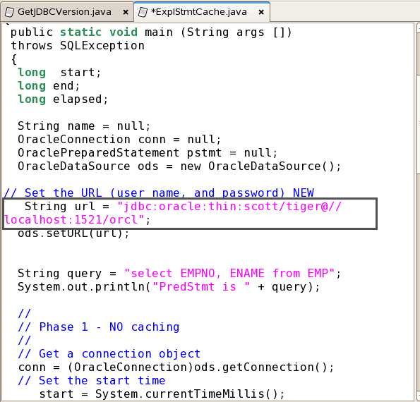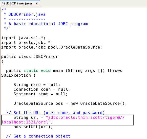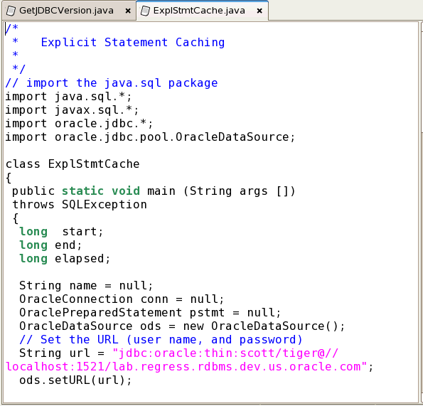 In this exercise, you start with a basic JDBC program (JDBCPrimer.java), then learn how to programmatically get the JDBC version, implement both Implicit and Explicit Statement Cache, and Query Change Notification.
