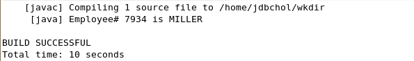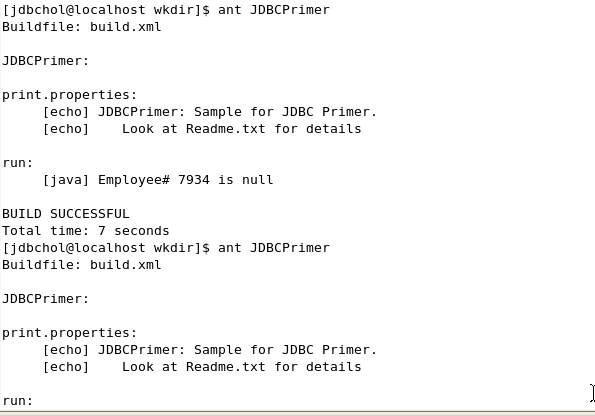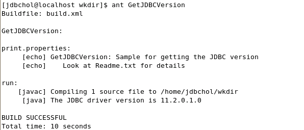 In a terminal window, change to the wkdir directory. Use ant to build and run the xml file. ant GetJDBCVersion