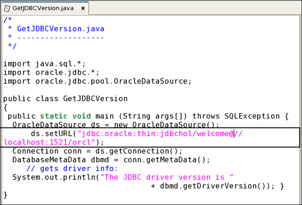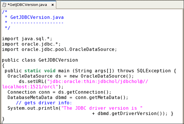 Open and examine the GetJDBCVersion.java file located in the wkdir directory. This program returns the JDBC driver version from the database.