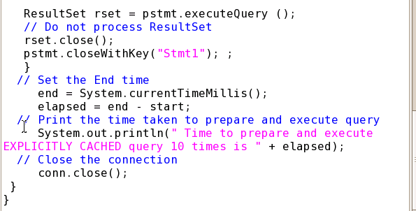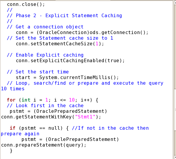 Determining whether explicit caching is enabled is achieved by invoking getExplicitStatementCachingEnabled(). This method returns true if explicit caching is enabled. It returns false is explicit caching in not enabled. A cache entry is allocated to a new SQL statement (if not already in the cache) upon the invocation of the createStatement(), prepareStatement(), and prepareCall() methods. It is up to the application to search the cache for a match using the user-defined key (a Java string) specified during the closeWithKey(String) method, using the following: