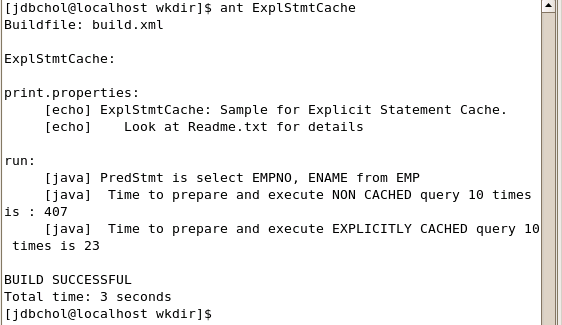 In a terminal window, change to the wkdir directory. Use ant to build and run the xml file. ant ExplStmtCache