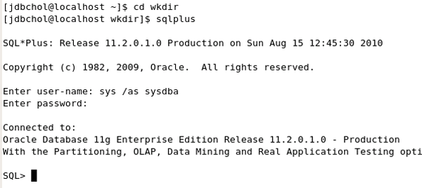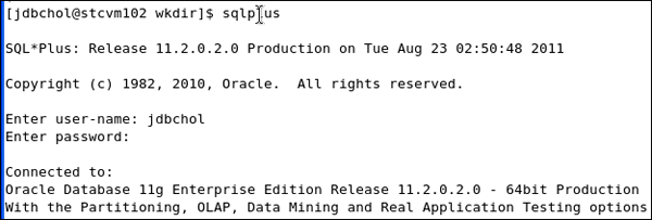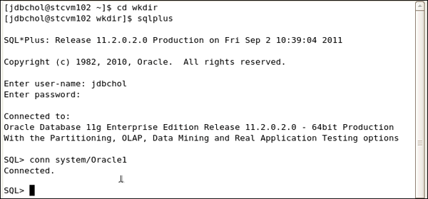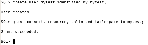 You need to create a user mytest and grant connect, resource, unlimited tablespace privileges. Open a terminal window, change to the wkdir directory. Start SQL*Plus. When prompted, enter sys /as sysdba for the user-name and Oracle1 for the password. cd wkdir