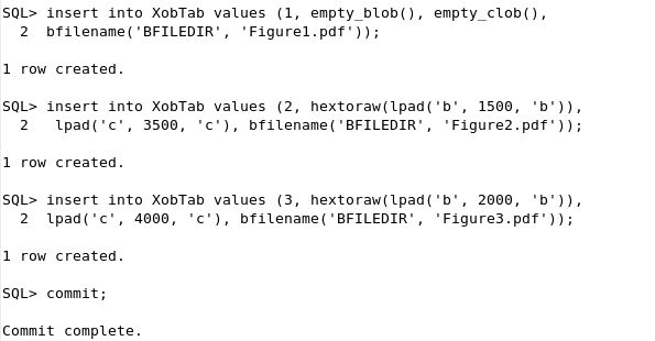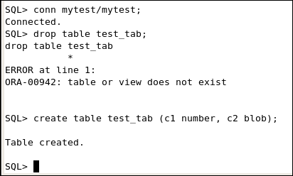 Connect as mytest and create a table test_tab. conn mytest/mytest create table test_tab (c1 number, c2 blob);
