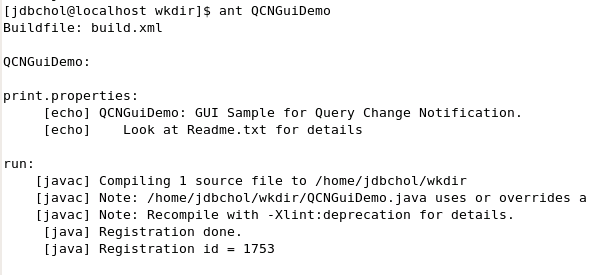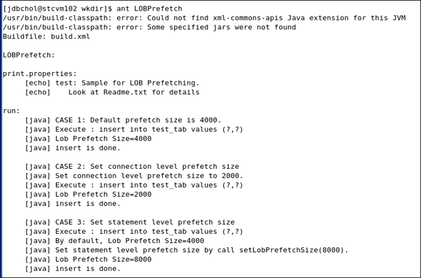 We also furnish an Ant file for each topic: BatchInsert.xml, JDBCPrimer.xml, GetJDBCVersion.xml ExplStmtCache.xml ImplStmtCache.xml QCNGuiDemo.xml. These files are available in the wkdir directory.