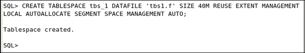 To create a tablespace, execute the following command: CREATE TABLESPACE tbs_1 DATAFILE 'tbs1.f' SIZE 40M REUSE EXTENT MANAGEMENT LOCAL AUTOALLOCATE SEGMENT SPACE MANAGEMENT AUTO;