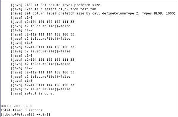 To test LOBPrefetch program with Secure File, you need to create a Auto allocate segment space management (ASSM) tablespace and turn on secure files. Perform the following steps: Start SQL*Plus. When prompted, enter jdbchol for the user-name and welcome for the password. cd wkdir connect sys/Oracle1 as sysdba;